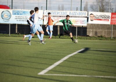 San Prospero Partita bellissima dello Junior Finale che sul sintetico di San Prospero fa valere da subito la propria voglia di vincere. Non passano neppure 500 secondi e i neroverdi sono già avanti: azione tambureggiante di Pancaldi che calcia, la palla finisce sulla testa di Bernabiti che non sbaglia e dà continuità alla doppietta segnata domenica scorsa a Nonantola. Al 14’ la partita potrebbe già andare in naftalina ma il tiro di Carpeggiani, servito dopo una azione offensiva di Cammarino, finisce contro il palo. Al 22’ il raddoppio, bellissimo per la pregevole costruzione: Veratti fa da boa e trova un filtrante per Carpeggiani: il 10 punta forte, ma quando si vede chiuso sterza e appoggia lateralmente per Ferri che si aggiusta la palla e segna, festeggiando così la convocazione in rappresentativa regionale. Ma il San Prospero non è morto, anzi. Prova con un paio di affondi ma è al 43’ che i padroni di casa vanno vicinissimi al 2-1: Ceci scatta in profondità, la difesa finalese è sorpresa, tiro angolato che centra il palo.